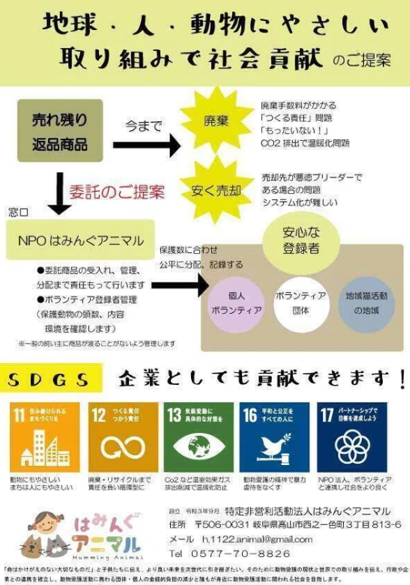 | 事業内容 | ・動物愛護活動の支援 ・生活困窮者・高齢者・障がい者等が、ペットとの生活を継続するための相談支援 |